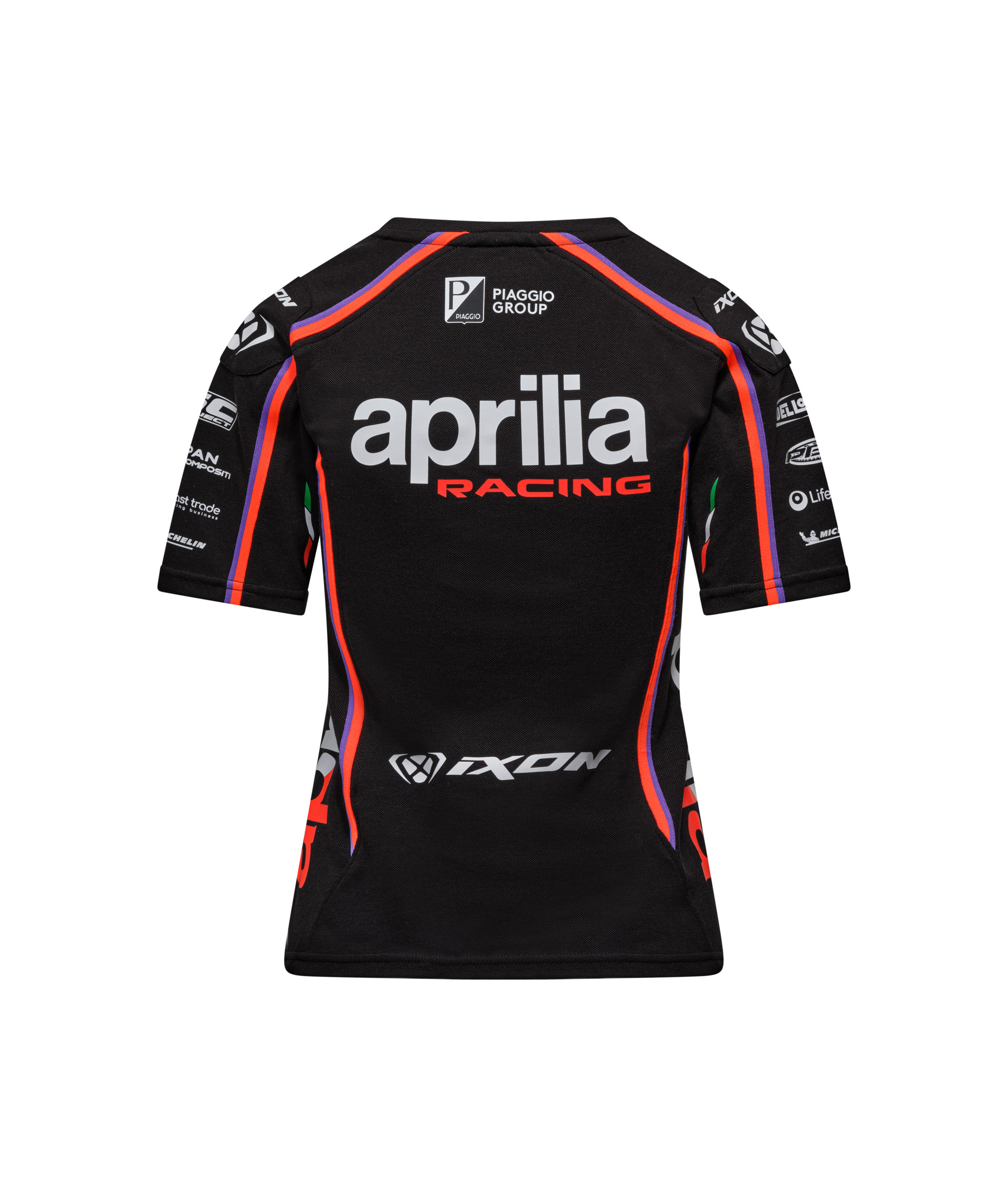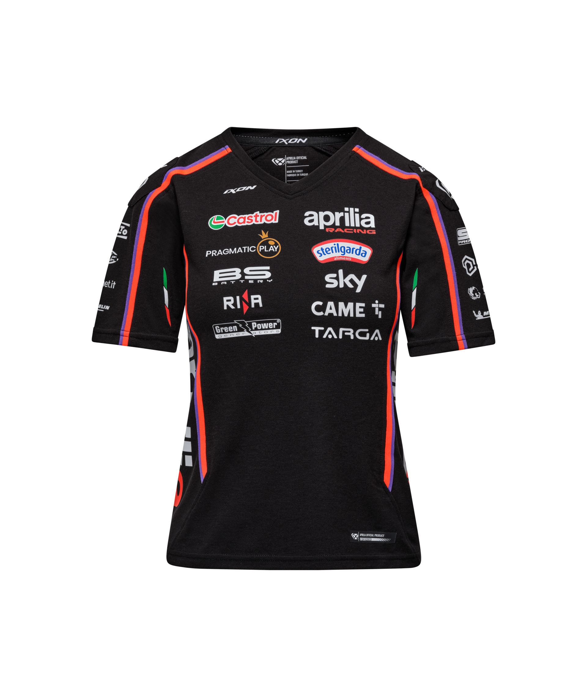 Zeigen Sie Ihre Unterstützung für Aprilia Racing mit dem Aprilia Racing MotoGP Replica T-Shirt für Damen. Dieses schwarze und neonrote T-Shirt ist eine exakte Replik des Designs, das vom Aprilia Racing Team im MotoGP 2025 getragen wird. Dieses T-Shirt bietet eine bequeme Passform mit einem technischen Material, das von der Rennausrüstung inspiriert ist. Die Grafiken auf dem T-Shirt sind von der 2025-Lackierung der Aprilia Racing-Motorräder inspiriert und verleihen Ihrer Rennkleidung einen einzigartigen Touch.